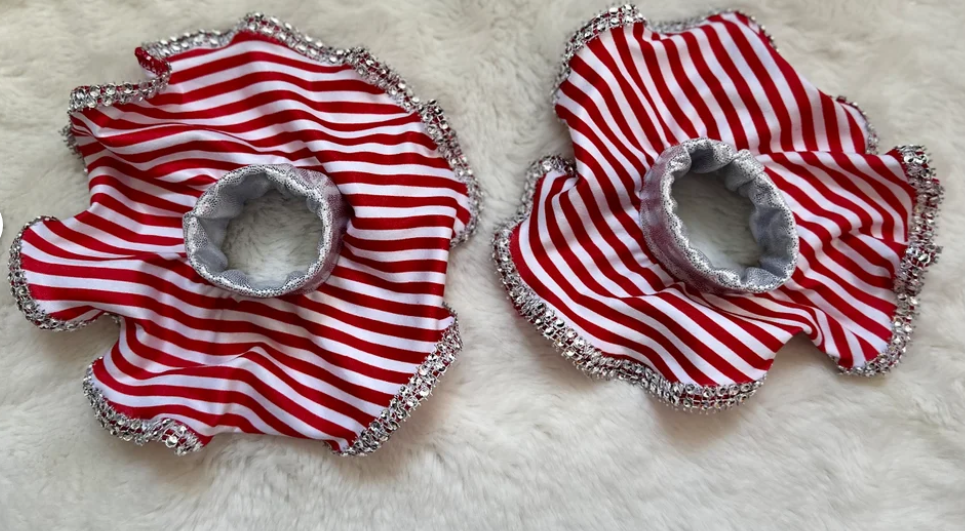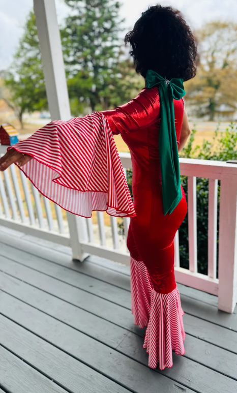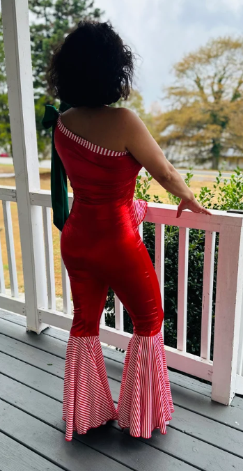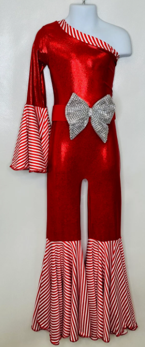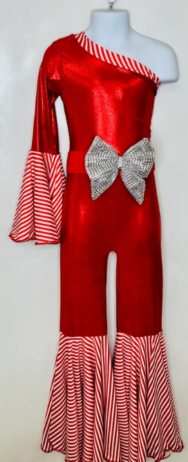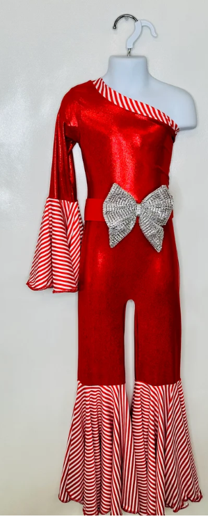 Candy Cane Christmas Jumpsuit for Kids Also Available In Adult Sizes|Detachable Train, Bow Belt, Hair Bow, Wrist Cuffs|Sold Separately