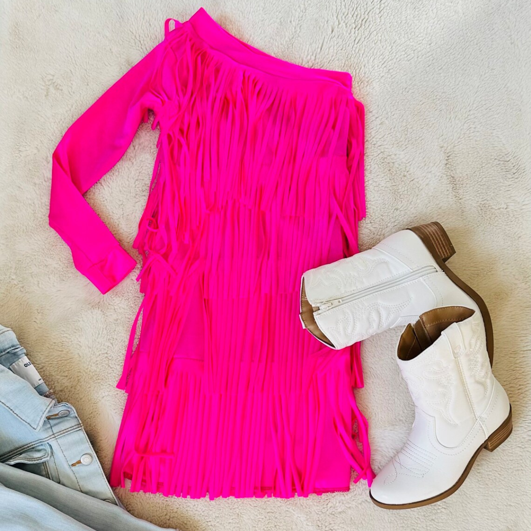 Order now and let your child's free spirit shine with this stylish and versatile one shoulder fringe dress!